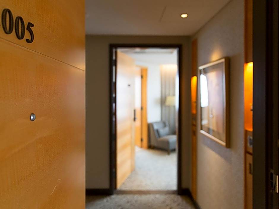 These two adjacent rooms each include a king bed, shared foyer, smart TV with casting, drip coffee, snacks, a work desk, and central air. Marble bathrooms feature separate wet/dry areas.
